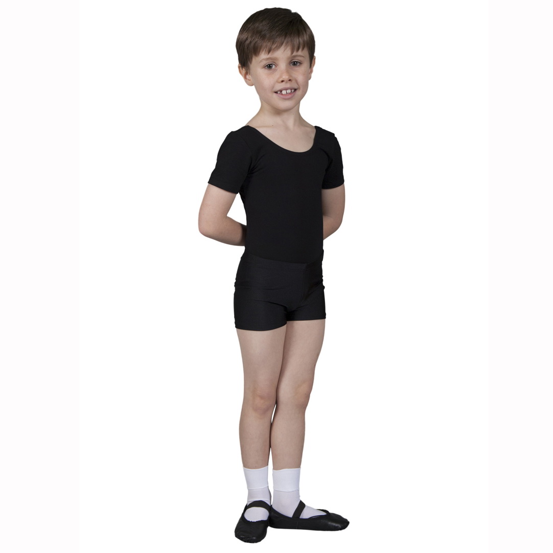 Boys black cotton Lycra ballet dance leotard by Dancing Daisy - Lovely quality plain fronted, short sleeved leotard with plenty of stretch. Great for examinations, uniform, classes, ballet, tap dance, acrobatics, modern dance and gymnastics. Boys leotard also available in white. Leotard only, shorts available separately.